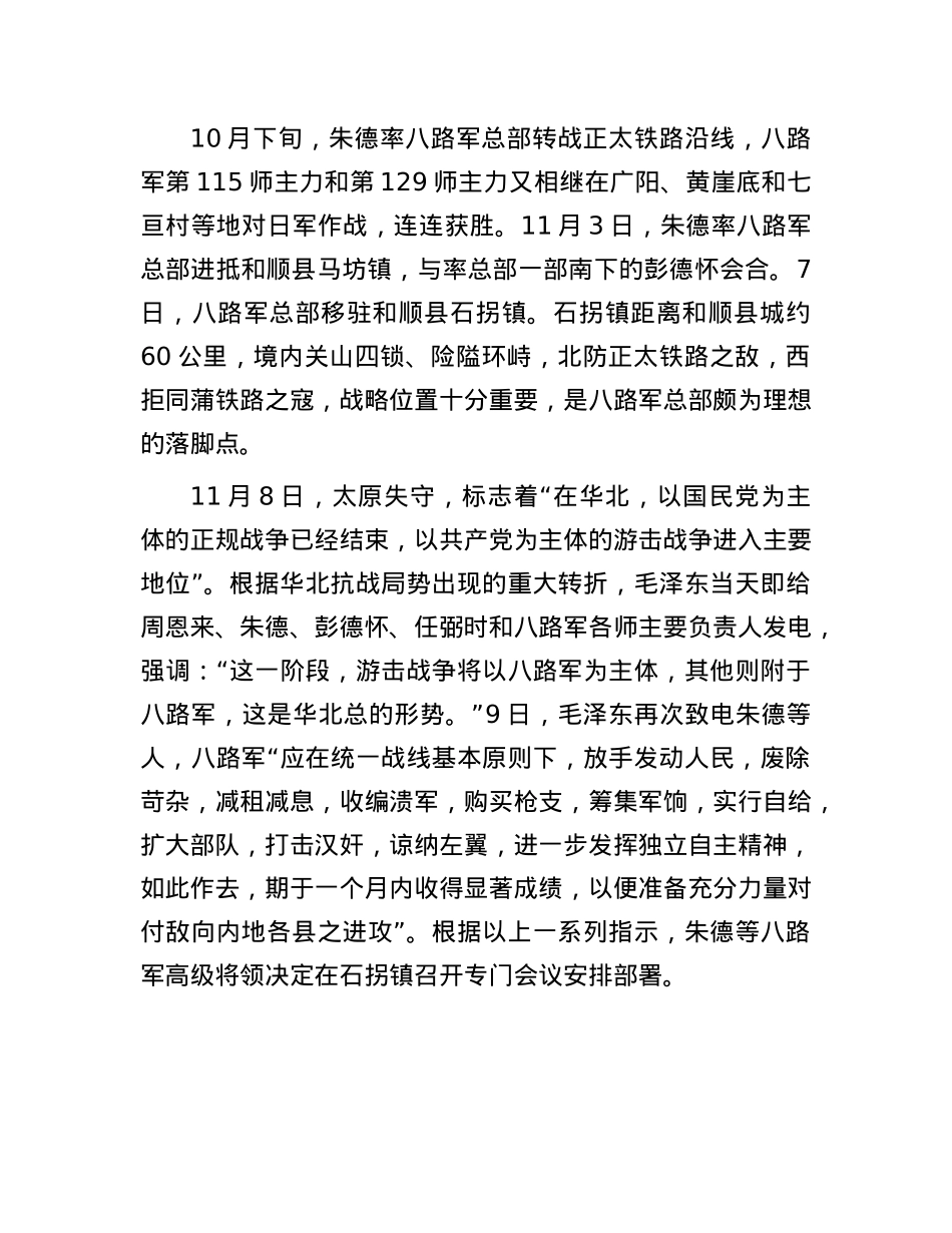 石拐会议:八路军分兵挺进华北敌后的动员会议全面抗战爆发后,八路军创建了晋察冀、晋绥、晋冀鲁豫“”三大 晋 字头抗日根据地,使山西成为华北抗战的战略支点。华北敌后抗日根据地的开辟,可以追溯到 1937 年 11 月在山西省和顺县石拐镇召开的两次会议,即 11 月 11 日八路军总部召开的领导干部会议和 11 月 13 日第 129 师召开的师部干部会议。这两次会议统称石拐会议。会议作出了及时实行战略转变、开创华北敌后抗日根据地、贯彻执行独立自主的山地游击战等一系列战略部署,在八路军历史上具有重要意义。1937 年 8 月 25 日,中央军委发布命令,宣布红军主力改编为国民革命军第八路军(简称八路军),之后迅速开赴山西抗日前线。9 月 25 日,八路军第 115 师主力在平型关伏击日军,歼敌 1000 余人,击毁汽车 100 余辆,极大地振奋了全国军民的抗战信心。接着八路军 3 个师又配合友军进行忻口战役。第 115 师主力于晋东北袭击内外长城间的交通线,并派独立团和骑兵营向察南、冀西出击。第 120 师在雁门关以南伏击日军。第 129 师以 1 营兵力夜袭阳明堡日军飞机场,毁伤敌机 20 余架,削弱了敌人的空中突击和运输力量,有力地配合了友军在正面战场的作战。10 月下旬,朱德率八路军总部转战正太铁路沿线,八路军第 115 师主力和第 129 师主力又相继在广阳、黄崖底和七亘村等地对日军作战,连连获胜。11 月 3 日,朱德率八路军总部进抵和顺县马坊镇,与率总部一部南下的彭德怀会合。7日,八路军总部移驻和顺县石拐镇。石拐镇距离和顺县城约60 公里,境内关山四锁、险隘环峙,北防正太铁路之敌,西拒同蒲铁路之寇,战略位置十分重要,是八路军总部颇为理想的落脚点。11 月 8“日,太原失守,标志着 在华北,以国民党为主体的正规战争已经结束,以共产党为主体的游击战争进入主要”地位 。根据华北抗战局势出现的重大转折,毛泽东当天即给周恩来、朱德、彭德怀、任弼时和八路军各师主要负责人发电,“强调: 这一阶段,游击战争将以八路军为主体,其他则附于”八路军,这是华北总的形势。 9 日,毛泽东再次致电朱德等“人,八路军 应在统一战线基本原则下,放手发动人民,废除苛杂,减租减息,收编溃军,购买枪支,筹集军饷,实行自给,扩大部队,打击汉奸,谅纳左翼,进一步发挥独立自主精神,如此作去,期于一个月内收得显著成绩,以便准备充分力量对”付敌向内地各县之进攻 。根据以上一系列指示,朱德等八路军高级将领决定在石拐镇召开专门会议安排部署。11 月 11 日,八路军总部在石拐镇召开领导干部会议,朱德主持会议,彭德怀、任弼时、左权、刘伯承、张浩、宋任穷“”等出席。会议围绕 如何正确指导新阶段的抗日战争 这个紧迫问题讨论研究太原失守后的形势,具体部署了八路军 3个师主力分兵发动群众、开展游击战争和建立敌后根据地等工作。会议重新调整了八路军的战略部署,即第 120 师以管涔山脉为支点,创建晋西北抗日根据地,扼守中共中央、中央军委所在地陕甘宁边区的东部屏障;第 115 师除留一部在晋察冀边区外,其主力转至吕梁山区,创建晋西南抗日根据地;第129 师和第 115 师一部依托太行、太岳山脉,创建晋冀豫抗日根据地。11 月 13 日,第 129 师在石拐镇驻地召开师部干部会议师长刘伯承主持会议。会议传达了毛泽东和八路军总部关于创建以太行、太岳山脉为依托的晋冀豫抗日根据地的指示和决定;刘伯承作了游击战术和进一步开展敌后游击战争的动员报告,总结了全师抗战以来的工作,具体部署了开展敌后游击战争的行动和任务。刘伯承还特别表扬了秦基伟、赖际发等建立游击支队、开展地方游击战的成功经验,要求全师推广,部队要化整为零,分散到各地去深入发动群众;各团的每一个营都要抽出一个连,到指定区域同地方党组织、游击队一起开展斗争。11 月 11 日和 13 日召开的这两次会议,分别是八路军出师华北和第 129 师转战晋东南后的重要会议,在山西敌后抗战、华北抗日根据地创建和八路军发展史上具有重要地位。一是开创了共产党和八路军开辟抗日根据地的新局面。石拐会议后...